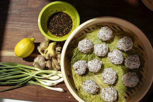 Add a couple inches of water to a wok or wide pan. Bring water to a boil, then place steamer over boiling water. (Water should not reach bottom of steamer.) Steam 25 minutes. Serve rice balls with ginger-soy dipping sauce.