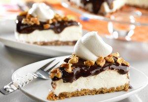 Spread the fudge topping evenly on top of the ice cream. Top with the pecans. Cover and freeze for 3 hours or overnight. To serve, cut into 10 wedges. Top with whipped cream, if desired.