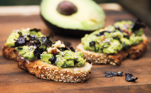 3. Toast bread in a toaster or oven broiler for 1 to 2 minutes on each side, until golden. Lightly brush each slice of toast with coconut oil and cut into quarters. Spread each quarter with a spoonful of avocado mixture, then sprinkle with chia seeds, remaining nori flakes, and walnuts. Plate and serve.