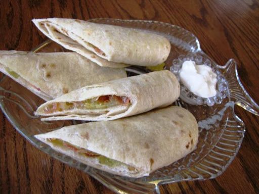 Cook potatoes according to directions on package. Stir together cooked potatoes with cheese, 1 c. sour cream, bacon, onion, salt and pepper. Warm tortillas and spoon mixture into center of each. Roll burrito style. Brush w/butter and place seam side down on baking pan. Bake 12-15 minutes at 350 degrees. Cool 5 minutes, cut separately into halves and serve w/sour cream. Refrigerate leftovers.