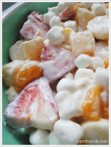 Cut up all fruit into bite size pieces. Mix lemon juie, sugar and eggs and cook on medium heat until thick - be careful not to cook too long or it will turn into scrambled eggs. Put in the freezer for 15 mins. Beat the whipping cream until thick, then fold in the lemon mixture. Add fruit and stir well. Keep refrigerated.