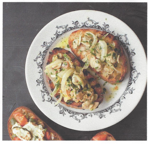 Pasta dressed with clam sauce has been a favorite in Italian households and Italian restaurants since forever, but have you ever tried to drown a piece of crusty Italian bread, still warm from the grill, with clam sauce? Well, here it is, and I promise this will become a favorite bruschetta in your home. It makes a delicious hors d’oeuvre, but it can also make a meal. It is a very good addition toa grilling party: have a bowl of this sauce handy, and as the bread comes off the grill, let everyone douse it with a spoonful of the sauce.