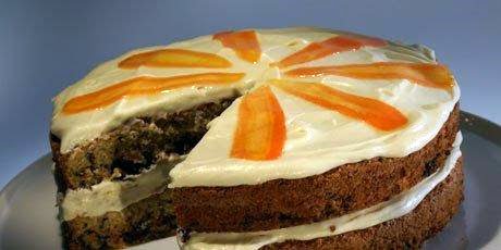 1. In a saucepan, bring the orange juice and sugar to a boil. Add the sliced carrots. Simmer until tender and translucent, about 8 minutes depending on thickness. Let cool completely. Drain. Twist each carrot slice and arrange on the cake to mark the slices.
