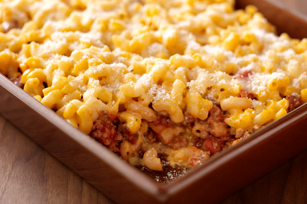 Prepare mac and cheese as directed on package. Brown ground beef and drain. Stir in spaghetti sauce. Layer 1/2 meat mixture and macaroni mixture in 8 in square dish. Repeat layers. Sprinkle with mozzarella. Bake at 375 degrees for 15 minutes.