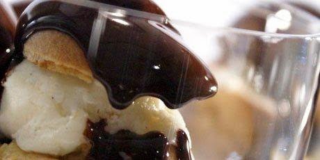 2. Slice the tops off the pastry balls and fill with scoops of ice cream. Place tops back on. Drizzle with hot chocolate sauce.