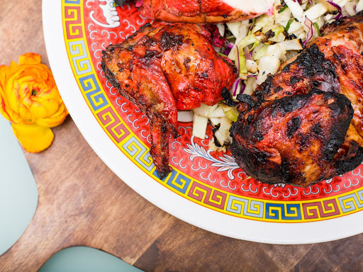 Build a medium-heat fire in a charcoal grill, or heat a gas grill to medium. (Alternatively, heat a cast-iron grill pan over medium.) Remove chicken from marinade, rub with oil, and season with salt and pepper; grill skin-side down, turning once, until charred and cooked through, about 30–35 minutes, or until an instant-read thermometer inserted into thickest part of the thigh reads 165°. Transfer chicken to a cutting board and let rest 15 minutes before carving.