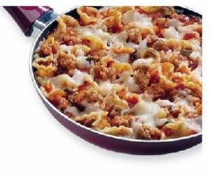 Brown and drain meat. Cook noodles as directed on package to desired doneness. Add meat and noodles to tray. Pour in sauce. Mix ricotta,egg,salt,pepper and oregano in a bowl. Add to meat and sauce in tray and mix well. Bake at 375 degrees for 45-50 minutes.