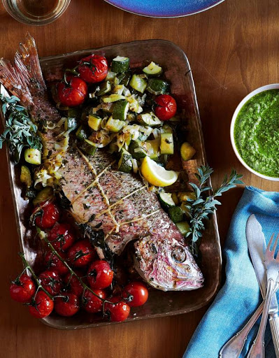 Remove roasting pan from oven, and lay fish over vegetables. Return pan to oven and cook until fish’s flesh slides on bone when prodded, indicating that it is just cooked through, and vegetables are completely soft, about 20 minutes more.