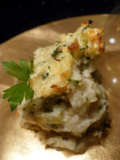 Boil Potatoes. Mash and let cool in large mixing bowl a little. Add fried celery and onions. Wet bread and add to vegetables in bowl,keep mixing periodically. Stop adding bread when fluffy and you don't see potatoes anymore. Add eggs when it starts getting tough to mix.