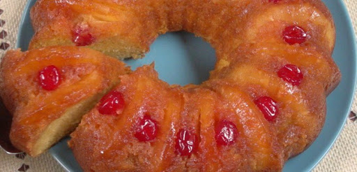 Cool the cake for about 10 minutes before running a knife around the edges and inner ring of the pan. Invert onto a serving plate and slice between pineapple rings to serve.
