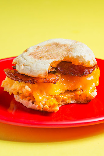 5. To serve, top the bottom half of the English muffin with the egg, cheese slices and bacon. Close with the remaining top half and eat immediately.
