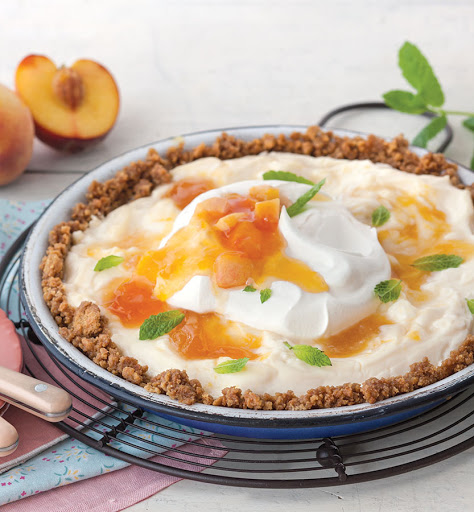 Spoon 1⁄4 cup peach preserves over filling; swirl gently using a knife. Stir together peaches and remaining 1/4 cup preserves. Top pie with whipped cream; spoon peach mixture over top. Sprinkle with mint, if desired.