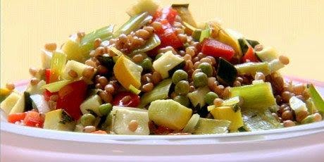 3. Remove from heat and stir in peas, oregano and lemon zest. Once vegetables and wheat berries are cooled, combine together. Stir in lemon juice and season to taste. Chill until ready to serve.