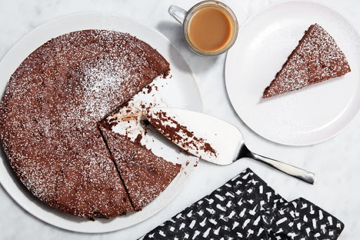 3. Dust cake with additional cocoa powder and serve with sorbet if desired. (Cake keeps, after being cooled completely, in an airtight container, 1 week.)