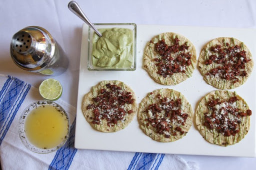 Rick Bayless | “Almost Oaxacan” Grilled Tostadas with Chorizo, Tangy Guacamole and Fresh Cheese