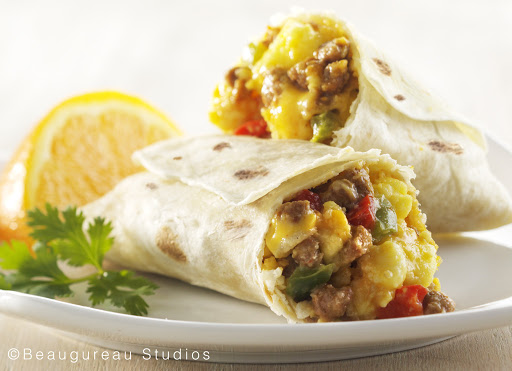 Spoon 3/4 cup egg mixture across center of each tortilla. Fold bottom and sides of tortilla over filling and roll up. Add toppings of your choice. Yield: 10 servings.