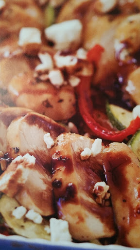 5. Remove chicken, slice and return to the dish. Top with crumbled feta cheese and drizzle with balsamic vinegar.