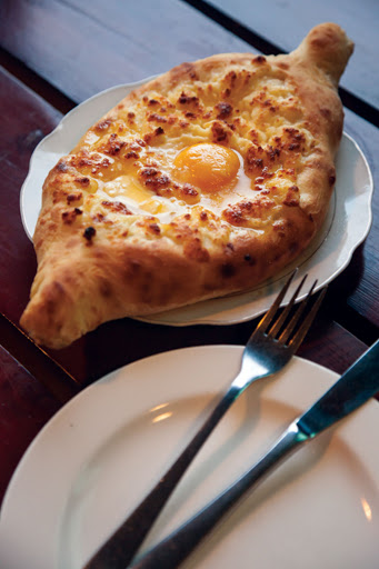 Place a pizza stone on a rack in lower third of oven. Heat oven to 500° for 1 hour. Combine cheeses in a bowl; set aside. Punch down dough and divide in half. On a piece of lightly floured parchment paper, roll half of dough into a 10" circle about 1⁄8" thick. Spread a quarter of the cheese mixture over dough, leaving a 1⁄2" border. On one side of the circle, tightly roll dough about a third of the way toward the center. Repeat on the opposite end. There should be a 2"-3" space between the two rolls. Pinch the open ends of the rolls together and twist to seal, making a boat shape; place another quarter of the cheese mixture in the middle; repeat with remaining dough and cheese. Transfer boats on paper to stone; bake until golden brown, 14–16 minutes. Crack 1 egg into the center of each boat. Return to oven until egg white is slightly set, 3–4 minutes. Place 2 tbsp. butter on each bread; serve hot.
