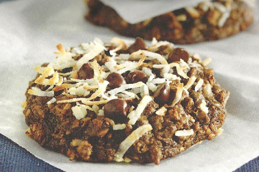 2. Heat oven to 350 degrees. Lightly grease cookie sheet. Using a 1/4-cup ice cream scoop or measuring cup, drop dough about 4 inches apart onto prepared cookie sheet. Sprinkle cookie tops with remaining coconut. Top with remaining chocolate chips (about 9 chips per cookie); lightly press into dough.