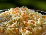 Cut cabbage in quarters and remove core. Peel carrots and onion and cut into pieces that would fit through the feed tube of a food processor. Fit food processor with the large-holed grater attachment and push cabbage, carrots, and onions through feed tube to grate. In a large bowl, toss vegetables together.