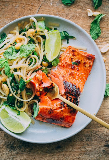 Heat roughly one tablespoon neutral cooking oil over medium-high heat in a large 12-inch non-stick skillet. Add the salmon fillets, skin-side down, and cook for 3 to 4 minutes (time will vary depending on the thickness of your salmon fillets - my filets were about 1-inch thick). Flip the fillets and continue cooking until the flesh is slightly opaque in the center and the the salmon is caramelized, about 1 to 2 minutes. Distribute the Thai noodle salad, top with a piece of glazed salmon, and serve. Garnish with lime wedges for squeezing.
