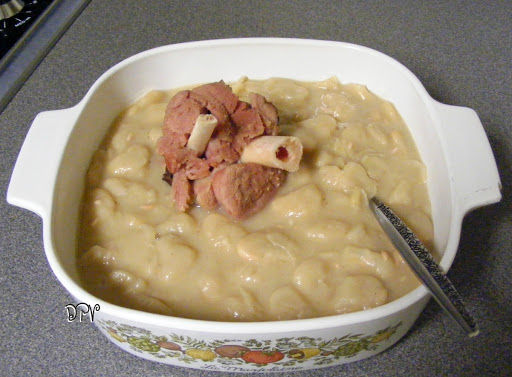 *These shanks had the BEST flavor. They were "fully cooked" smoked ham shanks from Rouse's, 8-10 in a vacuum pack. I used only 1 in the beans for seasoning (so they wouldn't be too greasy), but boiled extras in a pot of lightly salted water for an hour or so with lid tilted.