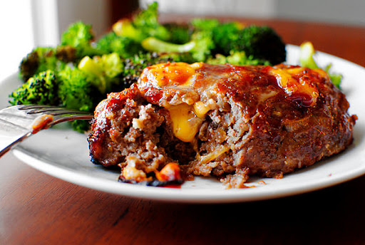 Preheat oven to 425 degrees. In a large bowl combine ground beef, egg, Worcestershire sauce, 2 Tablespoons BBQ sauce, panko bread crumbs, dash of pepper, cheese cubes, and caramelized onions, then mix until just combined. Divide mixture into 4 equal-sized portions then form into loaves on a foil-lined, non-stick-sprayed baking sheet. Spread 1 Tablespoon BBQ sauce over each loaf then bake for 20 minutes, or until no longer pink in the center.
