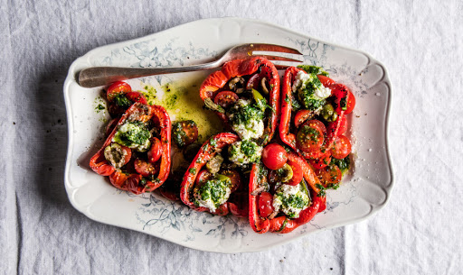 Arrange bell peppers on a platter. Top with tomatoes, ricotta, olives, and more basil, then drizzle with basil oil and season with sea salt and black pepper.