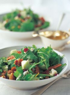 In a large bowl, toss together the arugula, apple, walnuts, cranberries, and blue cheese.
