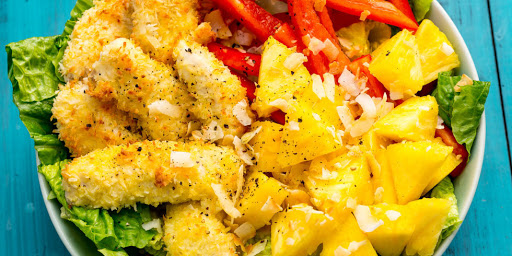 A great recipe for a lunch to take to the office or a light dinner. Baked coconut crusted chicken and salad dressed with lime, coconut milk, and pepper flakes.