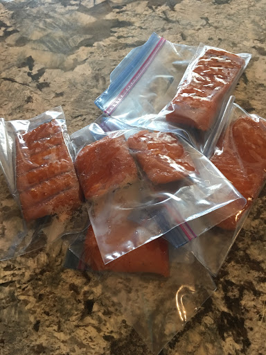 Cut salmon into pieces such as nuggets 1"x1" or strips 2" x 6" and 1/4" thick Cover the bottom of a plastic container with a 1/4" of salt/sugar mixture. Place larger, thicker pieces of salmon onto mixture. Continue layering brine mixture/salmon until all salmon is covered. Place in refrigerator.
