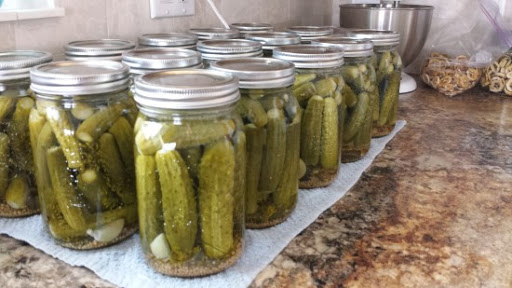 Soak freshly picked cucumbers in a tub of ice water overnight. (Do not use old cucumbers of the pickles will be rubbery). Wipe the pickles dry. Pack sterilized jars with several sprigs of dill, one clove of garlic at the top and bottom and the cucumbers.
