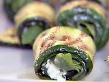Put 1/2 teaspoon of the cheese mixture about 1/2-inch from the end of a zucchini slice. Top with a few spinach leaves and 1 small, or half of a large basil leaf. Roll up and place seam side down on a platter. Repeat with the rest of the zucchini slices.