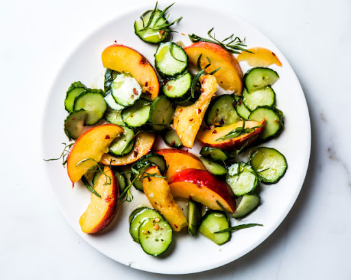 Here’s how I do it: Slice or smash 3 medium Persian cucumbers (you could also use one large English hothouse or Japanese cucumber, which are also thin-skinned and not too seedy). Halve and pit 2 ripe peaches, then cut into thin wedges. Combine the cucumbers and peaches in a bowl with the juice of one lime, a good pinch of flaky sea salt, and either a drizzle of hot sauce or a good pinch of dried chile (I like Aleppo-style pepper or Korean gochugaru for this). You could stop there and eat this straight out of the bowl, or you could add some fresh tarragon or cilantro leaves to dress it up a bit.