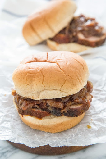 To serve, slice the pork tenderloin into 1/2-inch-thick slices. Divide the sliced pork between the rolls. Top with onion jam.