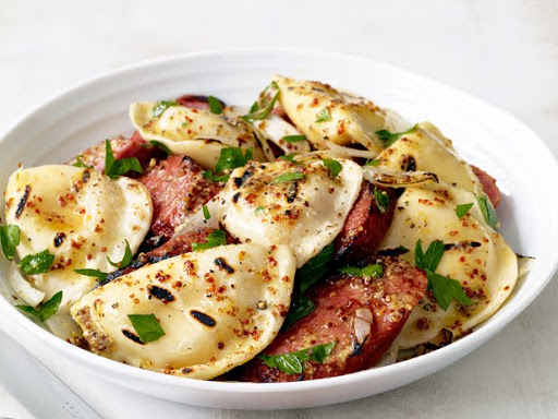 Slice the kielbasa into pieces and add to the bowl with the mustard dressing. Roughly chop the onion and add to the bowl along with the pierogies and parsley. Season with salt and pepper and toss. Divide among shallow bowls.