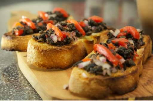 4. Remove bread from the oven and let cool until easy to handle. Spread a layer of cream cheese on each slice, then spoon olive mixture on top. Garnish with basil and a few pepper strips, if desired.