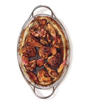 are tender, the chicken is glazed, and a thermometer inserted in the thickest part of a thigh registers 165° F, 15 to 20 minutes more. (Tent the dish loosely with foil if the chicken browns too quickly.)