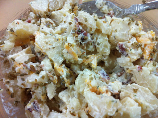 In a small bowl, combine mayonnaise, sour cream, dressing mix, and salt. Add to potato mixture, tossing gently to coat. Gently stir in cheese. Cover, and refrigerate for at least 4 hours before serving.