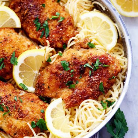 Crispy Parmesan Chicken with Creamy Lemon Garlic Pasta