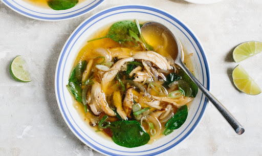 Pick meat from chicken, shred, and place in a small bowl (you should have about 4 cups); discard skin and bones. Heat oil in a large saucepan over medium-high heat. Add onion and mushrooms and cook, stirring occasionally, until softened and golden, 8–10 minutes. Add garlic and ginger and cook, stirring often, 2 minutes; season with salt and pepper. Add shredded chicken, broth, and cayenne and bring to a boil. Add spinach and divide soup among bowls. Top with scallions and serve lime wedges alongside for squeezing over.