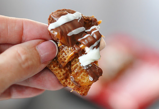 In small microwavable bowl, microwave caramel baking bits and cream uncovered on High about 1 minute or until chips can be stirred smooth. Use a spoon or fork to drizzle over snack. Microwave the milk chocolate baking chips next, starting with 20-seconds and stirring, then at 20 second intervals until the mixture is completely smooth (microwave temps vary, so watch the chocolate and stir frequently until it's of drizzling consistency). Drizzle over the snack mixture. Then microwave the vanilla (white) baking chips in 20-second intervals, stirring until smooth, and drizzle that over the snack mixture. (Note: The vanilla and milk chocolate chips should not need cream added.) Quickly sprinkle coarse salt over all while candy drizzles are still wet.
