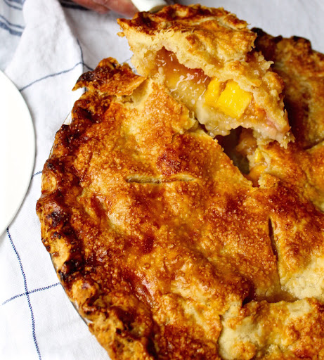 Make crust. In a food processor, pulse flour, sugar and salt to blend. Add cubed butter and lard and pulse on/off until mixture resembles coarse meal. You should still see pieces of butter and lard. Transfer mixture to bowl and add 5 tablespoons of ice water.