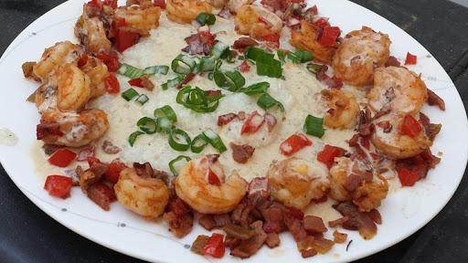 Divide the grits onto 2 serving plates and line the edge of each plate with 10 shrimp. Pour cream sauce over grits and sprinkle each serving with chopped green onion tops.