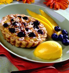 3. In a bowl, combine condensed milk, eggs and the remaining 1 cup coconut. Stir in blueberries. Spoon about 1/3 cup mixture into each shell. Bake until filling is set, about 25 minutes. Sprinkle with shredded coconut and serve with mango sorbet, if desired.