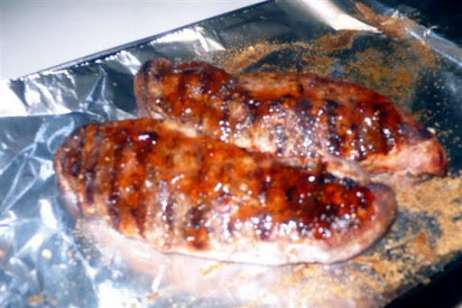Rub pork w/veg oil, then season with 1 tsp Old Bay and garlic. Heat grill to med.