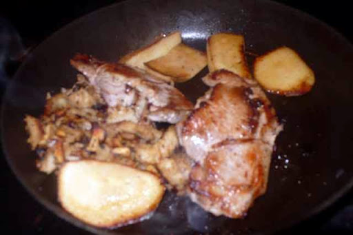 Saute shallots in 1 tbs butter in same skillet over med-hi. Add flour and cook 1 min. Deglaze w/cider, wine and vinegar; summer until slightly thickened, 2-3 min. Finish sauce w/apple jelly, thyme, salt/pepper if desired.