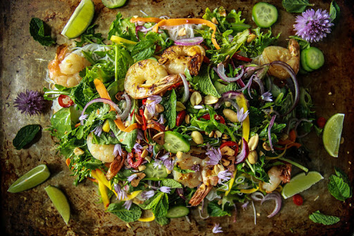 I plated this with the noodles on the bottom of the platter and then topped with the salad and shrimp. I garnished with chopped peanuts and chive blossoms.