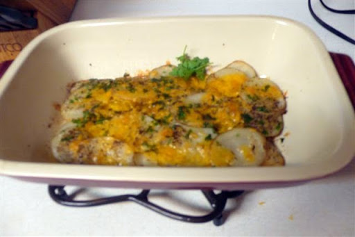 Thinly slice potatoes and place in ungreased 2 qt baking dish. In small saucepan, heat butter, onion, salt, thyme and pepper until butter is melted. Drizzle over potatoes. Cover and bake at 425 for 45 min. Sprinkle w/cheese and parsley. Bake, uncovered 15 min longer or until cheese melts.