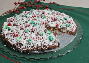 Grease 2 9-in pizza pans with butter. Prepare brownie mix as directed. Stir in peanuts, spoon into pans. Bake at 350 degrees for 15-20 mins. Cool in pan. Spread top with chocolate topping to within 1 inch of edge. Sprinkle with M&Ms. Over low heat, melt white chocolate and drizzle over top with spoon.